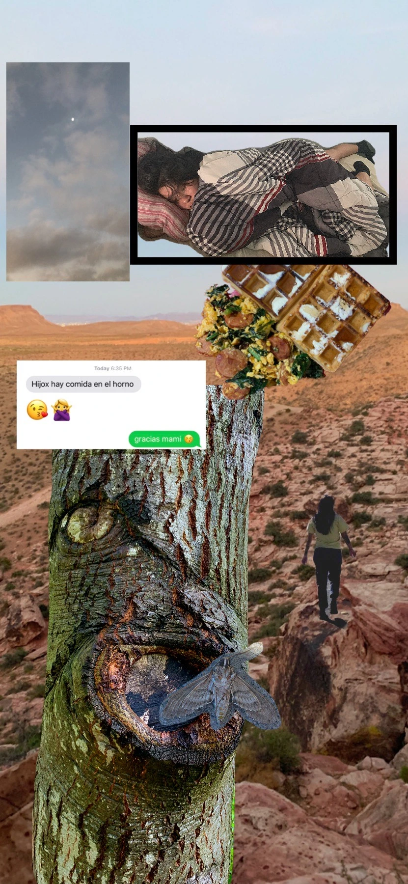 About the collage series: During the pandemic and under stay-at-home orders, I’ve been struggling with my mental health, memory and sense of self. This collage series honors this experience. All images in the collage series are personal photos I shot, except those taken of me and the screenshot of a text conversation. I quit my job in January to protect my mental health and haven’t found employment since the pandemic surged. Witnessing and experiencing the world through isolation as a poor, queer, trans, anxious and first-generation person is overwhelming. Sometimes I feel afraid and I forget who I am or my place in the world. Sometimes I feel brave and I remember who I’m becoming and how I can connect.