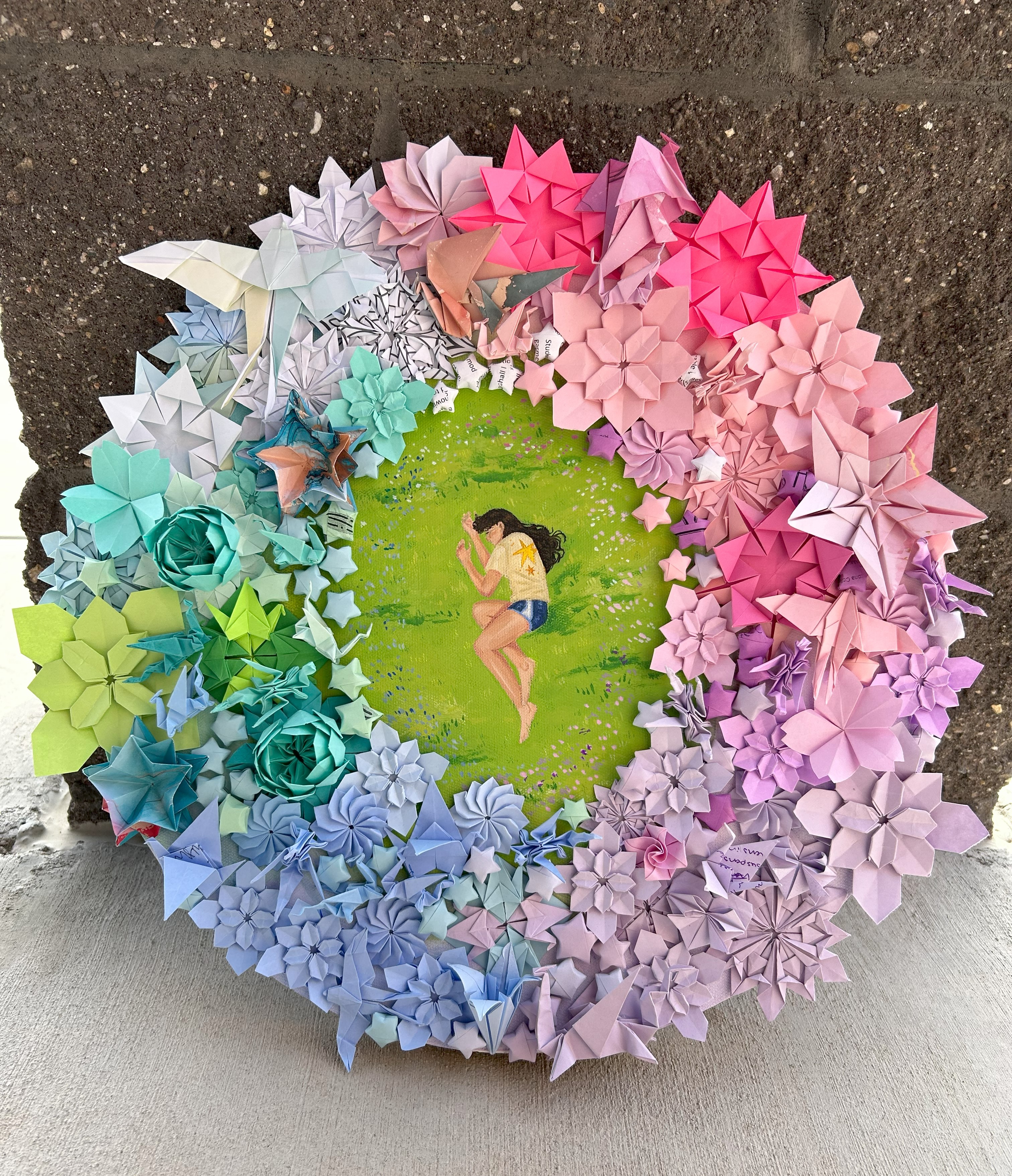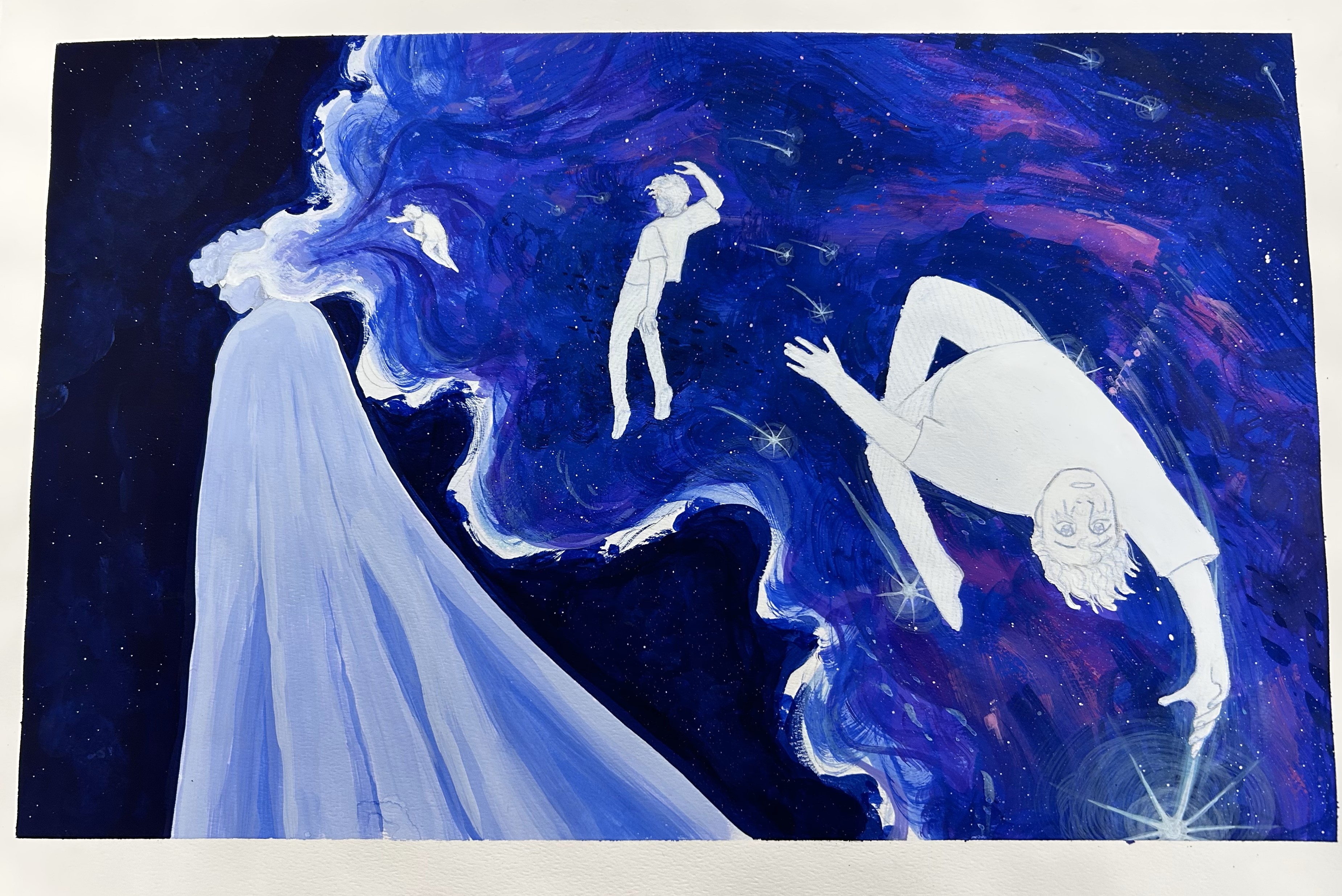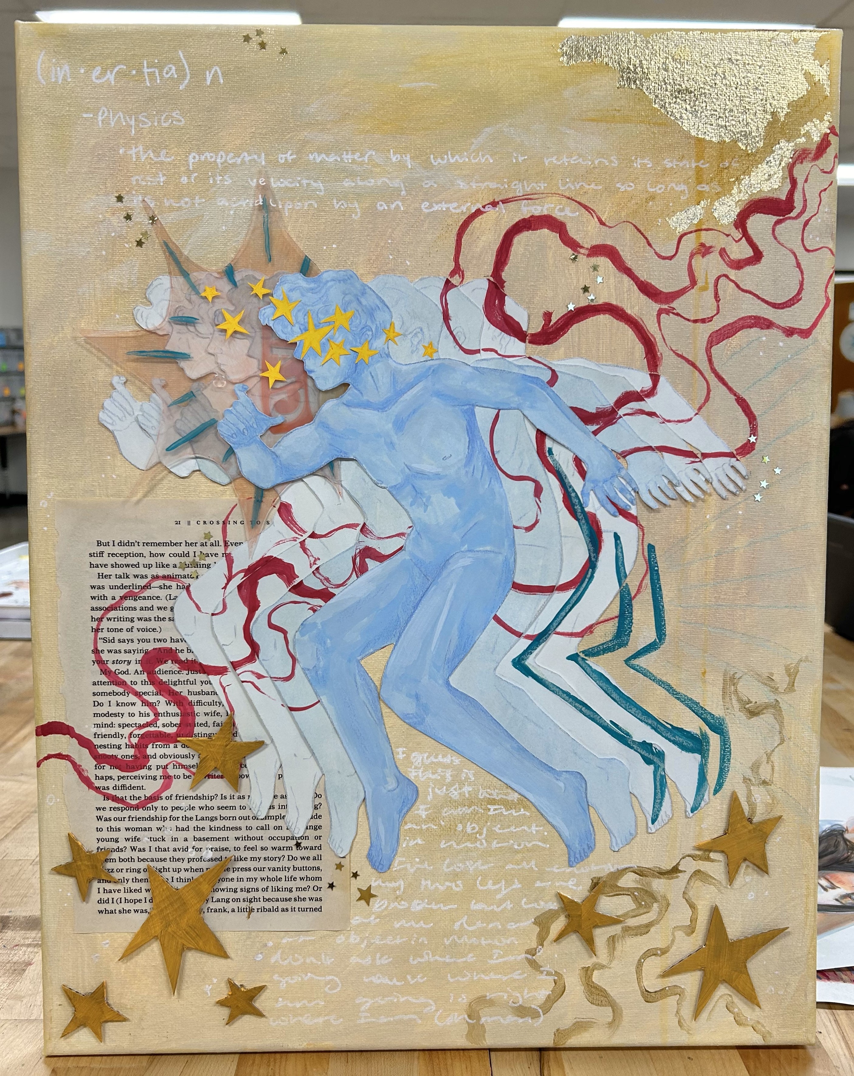 Through my art I aim to explore the body alongside its environment, whether that be the physical outside world or the internal personal world. These pieces are a conversation with the innermost parts of myself– whether that be conversations I’ve only had when I’ve closed my eyes, ones I’ve had staring in the mirror, or ones I have yet to have. These paintings can be whatever you want or need them to be about, but I just hope that while viewing them you’re able to see a part of yourself reflected within this art. All of my artwork is done with mixed media, and the result is this wonderful overlap of creation and unity that reflects our own ability to make art to give meaning to this thing we call life.